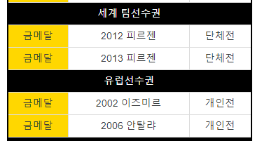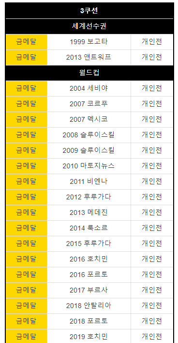 엄청난 금메달을 딴 선수로 1쿠션 금메달이 7개 (1990~2012) , 보크라인 금메달이 6개 (1991년~2009), 3쿠션 금메달이 23개 이상을 보유하고 있습니다 (1999~부터)