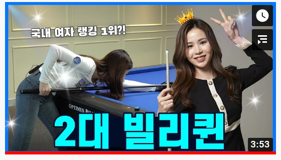 포켓볼 선수로 10년 이상을 활동하다가 3쿠션 선수로 전향한 김진아 선수가 유튜브 빌리퀸 채널에서 한주희 다음으로 새로운 빌리퀸이 되어 화제가 되고 있습니다.