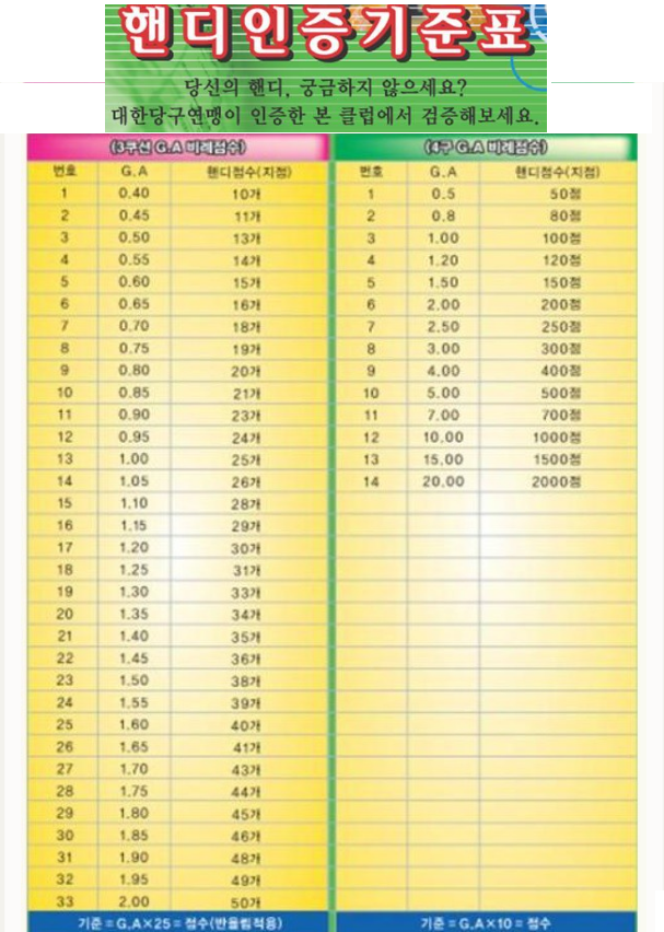 아래는 대한당구연맹 핸디 기준표 입니다. 같이 참고하시면 될듯 합니다. 대한당구연맹 핸디기준표가 더 높아보이네요.