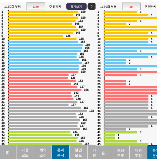 여기서 부터는 설정한 기간동안 각 번호가 등장한 횟수를 분석할 수 있습니다. 이로 인하여 로또 번호 출현 패턴을 연구하기에 적합하고, 뒤에 설명할 달인모드와 같이 쓴다면 더 좋은 효과를 볼 수 있습니다.